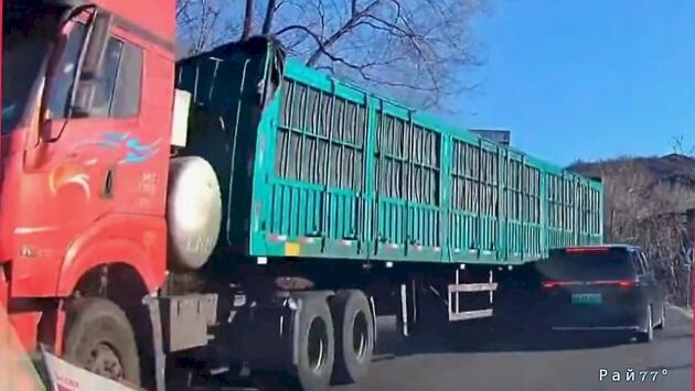 Китайский автолюбитель совершил рискованный манёвр на повороте автомагистрали и его транспортное средство было снесено задней частью большегруза.
