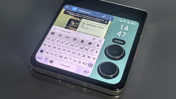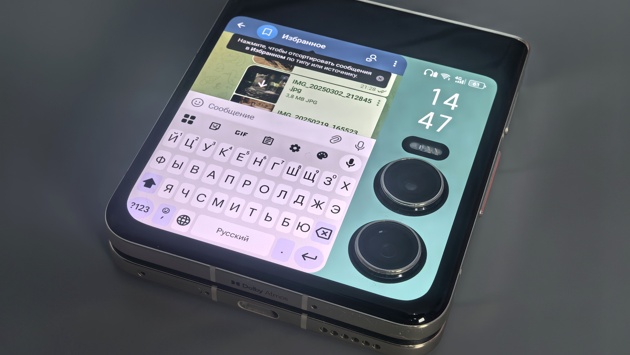 Внешний экран довольно крупный. Это квадрат 3,64 дюйма, с большими возможностями по кастомизации. От анимации в виде питомцев до создания обоев в с помощью искусственного интеллекта. Виджет Dinamic Port, как можно догадаться из названия, по функциональности близок к Dynamic Island в iPhone и работает на обоих экранах. Прямо на внешнем экране есть вызов клавиатуры, и можно ответить на сообщение в том же Telegram, не раскрывая телефон.