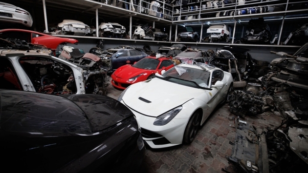 На другой фотографии два разбитых McLaren зажимают то, что кажется Bentley Mulsanne, в то время как стены увешаны разрезанными экзотическими автомобилями и запчастями.
