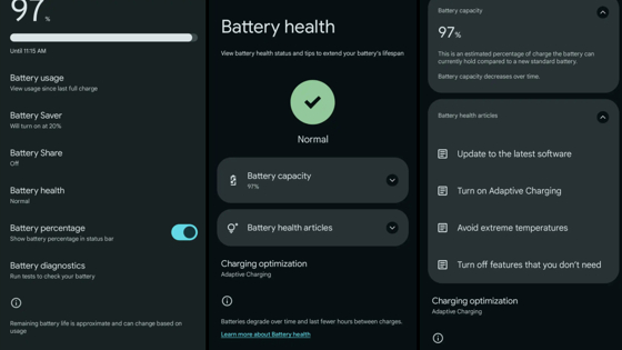 Статус батареи отображается в виде зелёной галочки, указывая, что всё в порядке. Ранее Google поясняла, что ёмкость используемой батареи указывает приблизительный процент заряда, который она способна удерживать в данный момент по сравнению с новой батареей. Это значение уменьшается со временем.