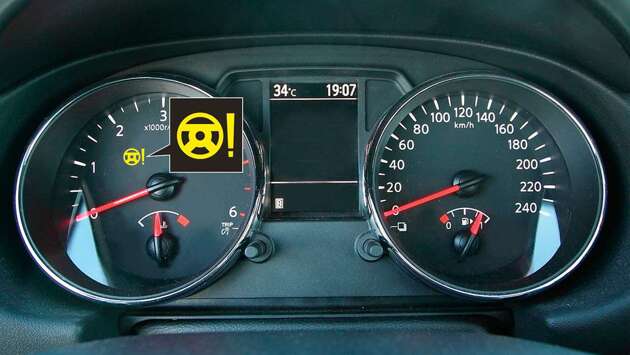 Останавливая автомобили для проверки документов, работники ГАИ не зря смотрят на панель приборов – там можно найти повод для штрафа и эвакуации.На приборной панели легкового автомобиля зажглась контрольная лампа желтого цвета с изображением рулевого колеса, при этом заметно возросло усилие на руле. Можно ли продолжать движение? Отмечайте свой вариант в опросе ниже. А правильный ответ – на следующей странице. Правильный ответ: 3 «Симптомы» свидетельствуют о неисправности усилителя рулевого управления. Эксплуатировать такой автомобиль нельзя в соответствии с пунктом 2.1 Перечня неисправностей и условий, при которых запрещается эксплуатация транспортных средств. Более того, пункт 2.3.1 ПДД РФ при неисправности рулевого управления запрещает даже движение. За игнорирование этого запрета водителя оштрафуют на 500 рублей по части 2 статьи 12.5, а транспортное средство – задержат до устранения неисправности по части 1 статьи 27.13 КоАП РФ. Еще один тест на знание ПДД тут.