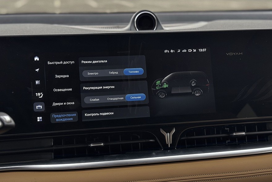 В гибридном режиме силовой установки, когда электроника сама решает, в каких условиях и как долго использовать ДВС для подзарядки батареи, в столичных пробках Dream выпивает по 8-9 литров бензина, в смешанном цикле с городским трафиком и загородными трассами – 7-8 литров. Для столь ураганной динамики и массы это очень даже достойный показатель. А вот электричество Voyah любит больше – 24-25 кВт·ч минивэн съедает легко.