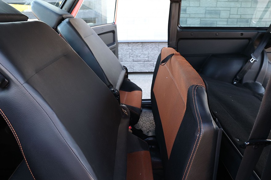 Комплектация «апельсиновой» серии – максимальная для Нивы. Имеются кондиционер, ГУР, ABS, электростеклоподъемники, обогревы передних сидений. При этом в салоне, согласно известному клише, замерло время. Тут и натяжной потолок на проволочных прутьях с белым винилом в мелкую «дырдочку», и жуткие подрулевые переключатели от «копейки», и замок зажигания под левую руку, и привычно заедающие рычажки отопителя, и все прочее. Да, с годами появились кнопочки включения обогревов сидений, кнопка и ручка кондиционера, для которых едва нашли место, крошечные вспомогательные дисплейчики на приборке – но это все та же Нива. Все новые элементы интерьера строго выдерживают классическую стилистику (чужеродным имплантом смотрится только блок клавиш стеклоподъемников от Гранты), что, с одной стороны, и неплохо, а с другой – кровь из глаз. До серьезного рестайлинга салона, произошедшего в 2019 году, эта Нива не дотянула всего два года.