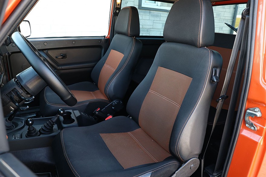 Интерьер подогнан под цвет кузова контрастной обивкой кресел и оранжевой прострочкой.