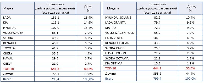 По данным маркетингового агентства НАПИ, на 01.10.2025 парк такси в России состоит из 799,4 тыс. легковых автомобилей с действующим разрешением. Самыми популярными моделями в парке являются LADA (16,4%), KIA (14,9%) и HYUNDAI (13,4%). Десятка лидеров занимает более 80% парка такси. При этом среди свежих автомобилей (2022-2025 годов выпуска) в парке преобладают марки LADA (8%), CHERY (4,1%) и HAVAL (3,5%).