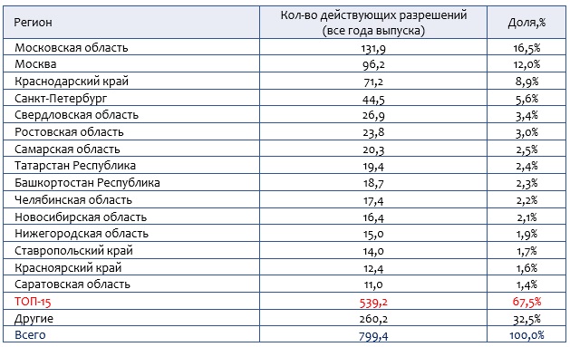 Наибольшее количество действующих разрешений среди автомобилей всех годов выпуска зафиксировано в Московской области (16,5%), Москве (12%) и Краснодарском крае (8,9%). При этом Санкт-Петербург расположился лишь на 4 месте (5,6%). Среди федеральных округов по числу действующих разрешений лидируют Центральный ФО (295,4 тыс. шт.), Южный и Северо-Кавказский ФО (146,1 тыс. шт.) и Приволжский ФО (132,1 тыс. шт.).