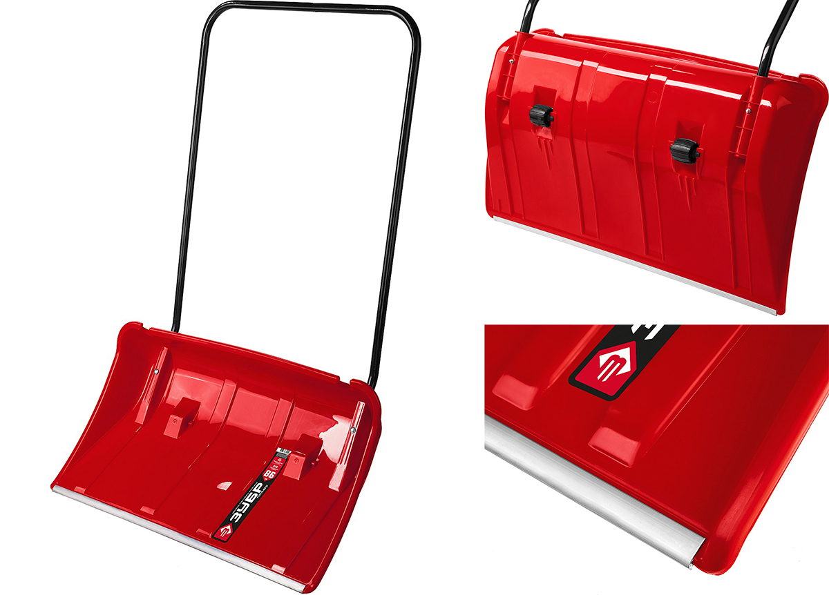 отличается удобной формой ковша и прочными материалами: стальная ручка и морозоустойчивый пластик (первичный полипропилен). Размер ковша — 860×500 мм. На нижней стороне имеются колесики для облегчения перемещения. Легкая и прочная алюминиевая окантовка рабочей кромки помогает справляться с наледью и защищает пластик от повреждений.