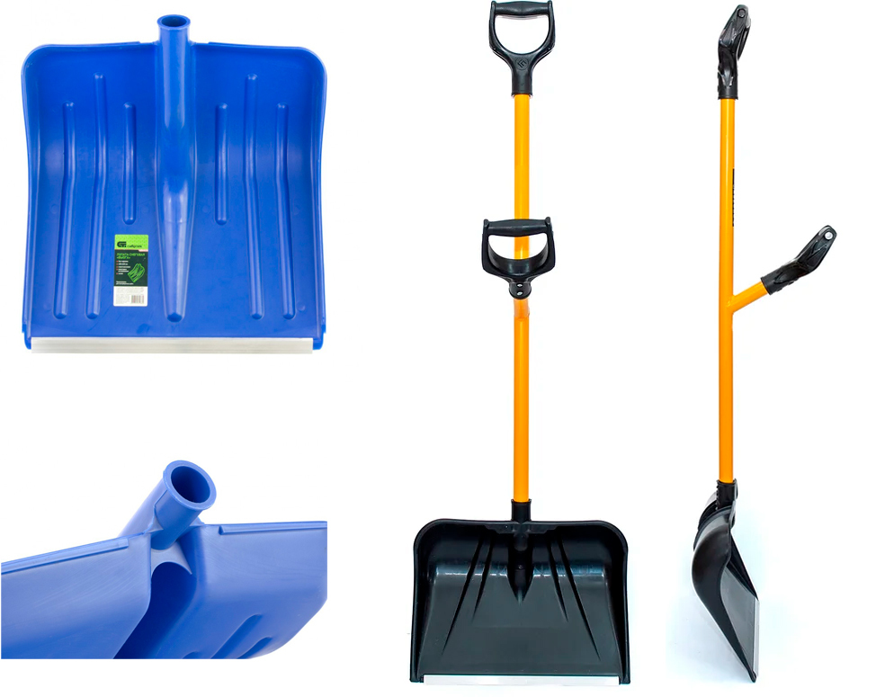 скреперы — ковш шириной 50-70 см, черенок под углом (снижает нагрузку на спину), часто с регулировкой высоты;движки — ковш 70-100 см, П‑образная ручка для двух рук, нередко с колесами (для площадей от 100 м²).