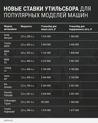 Ставки утильсбора для популярных моделей машин в 2026 году