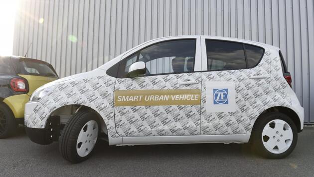 В этом году компании ZF Friedrichshafen AG исполняется 100 лет, и в ознаменование этой круглой даты она выпустила собственный электромобиль под названием Smart Urban Vehicle. Как в имени, так и во внешности концепта нет ничего впечатляющего: все инновационные решения кроются в его конструкции и дополнительном оборудовании. Два электромотора мощностью 54 л. с. каждый обеспечивают небольшому хэтчбеку весьма скромную динамику — например, максимальная скорость у него не превышает 150 км/ч — но это не главное. Инженерам ZF удалось создать уникальную конструкцию передней оси, благодаря которой максимальный угол поворота передних колес увеличился до 75 градусов (см. фото). В компании утверждают, что такая компоновка «существенно уменьшает усилие на руле при парковке и разворотах, улучшает маневренность».