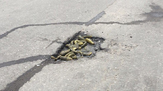 В Мурманске неизвестный заложил яму на дороге огурцами. Соответствующую фотографию выложили в интернет участники группы «Мурманск» социальной сети VK. В том же сообществе пользователи опубликовали пост о жителе города Оленегорск Мурманской области, который самостоятельно заасфальтировал дорожные ямы во дворе. «В Оленегорске местный автолюбитель устал ждать, и наблюдать за бездействием местной управляющей компании, и заасфальтировал участок дороги для парковки своего авто сам. Похоже, что мурманчанам придется заняться тем же самым», - написали о нем в социальной сети. В апреле 2016 года сити-менеджер Мурманска Андрей Сысоев рассказал, что городу тратит на ремонт порядка 300-350 миллионов рублей в год, при том, что необходимо на эти нужды 500 миллионов рублей.