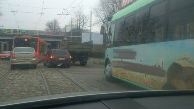 В Калининграде в полдень образовался дорожный затор на улице Киевской в районе трамвайного депо. Это произошло из-за дорожно-транспортного происшествия. Как сообщают очевидцы, там при перестроении из одной полосы в другую не поделили дорогу грузовой автомобиль и легковое авто. Повреждения, судя по всему не значительные, но участники ДТП обоих авто решили дождаться инспекторов ГИБДД. Троллейбусы объехать эти автомобили не смогли, поэтому вынуждены были встать. В результате движение по направлению в центр города оказалось осложнено. Автомобилистам приходится объезжать столкнувшиеся машины и вынужденно «прикованный» электротранспорт по трамвайным путям. Фото очевидцев. просмотров: 0