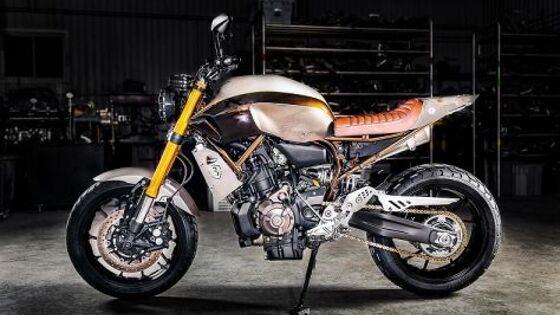 Контора Origin8or Cycles показала своё видение того, каким действительно должен быть нейкед Yamaha MT-07. Yamaha Canada, как раз и задумавшая этот проект, совсем мало размышляла над тем, к кому обращаться: конечно, к парням из Origin8or Cycles! В канадском офисе компании «Ямаха» ранее уже были знакомы с работами Роба Чэппелла, и они им очень даже нравились. Более того, Роб пообещал, что он подготовит настоящий шедевр с взрывным обликом и характером. Идея была в том, чтобы построить аппарат, отлично чувствующий себя не только в городе, но и при езде по пересечённой местности. Для этого мастерам пришлось сильно потрудиться. Так, сток-вилку сменили на ту, которая досталась от Yamaha XSR900, шины выбрали Pirelli MT60. При этом размерность резины, если сравнивать с заводским вариантом, осталась прежней. Заднюю подвеску также прилично «помучили», ведь нужно было увеличить клиренс. Бак для топлива решили сразу оставить стандартным, но, естественно, в таком случае кастомайзеры понимали, что нужно «отыгрываться» стилистически в чём-то другом, а потому, например, установили радиатор в эпатажном кожухе и фару в защитной «скорлупе». 689-кубовый двигатель слегка тоже перенастроили, но не критично. А вот выпускная система Hindle волнообразного вида должна и мощности прибавить, и звука добавить.