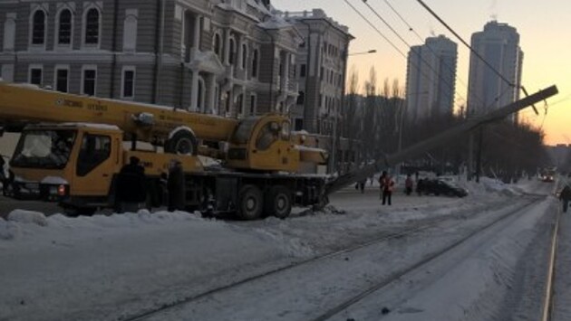 В Самаре возле бывшего СамГУ строительный кран снес трамвайную опору