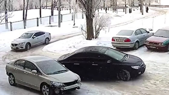 На Украине в припаркованную машину врезались семь раз за час. Видео произошедшего было выложено на YouTube и опубликовано во «ВКонтакте». В подписи к ролику, загруженному на видеохостинг, указано, что съемка велась камерой видеонаблюдения, установленной на доме. Автор указывает, что владелец автомобиля Honda Civic, вернувшись с работы, оставил его поздно ночью в неудачном месте, поскольку других не было, а утром его ждал неприятный сюрприз. Судя по кадрам, водители машин, которые цепляли Civic, не справлялись с поворотом на обледенелой неровной дороге. «История о том, какие у нас (...) водители в Харькове. Не один из водителей совершивших ДТП не оставил хотя бы записки в надежде, что никто его не найдет», — отмечает автор поста в группе «Авто Харьков City» в социальной сети. Многие интернет-пользователи считают, что хозяин Honda — специалист по автоподставам. На эту мысль наталкивает состояние машины (нет переднего, а, возможно, и заднего бампера, спереди отсутствуют госномера). «Очень похоже на подставу. Стоит на месте, где машины сносит в его сторону + четко под камерой. Сигналка не срабатывает, походу, тоже спецом отключена. Потом по камерам найдет владельцев машин, которые его зацепили, и будет деньги прикуривать с них», — отметил один из юзеров.