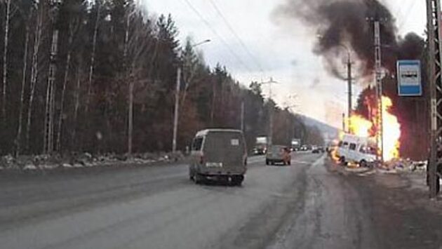 В городе Миасс Челябинской области столкнулись легковушка и маршрутное такси. После удара маршрутка сразу вспыхнула, и ее вынесло на обочину. Кадры ДТП записал видеорегистратор едущей неподалеку машины. Когда объятое пламенем маршрутное такси, наконец, остановилось, из него начали выпрыгивать перепуганные пассажиры. По словам очевидцев, виноват в аварии водитель легковушки, вылетевший на встречную полосу. Его из автомобиля смогли вытащить только прибывшие на место спасатели. Медицинская помощь потребовалась и одной из пассажирок маршрутки.