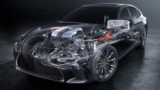 Компания Lexus презентовала на Женевском автосалоне гибридную версию флагманского седана LS 500h, которая отличается довольно оригинальной конструкцией. Lexus LS 500h получил многоступенчатую гибридную установку из 3,5-литрового бензинового двигателя V6 мощностью 295 лошадиных сил, двух электромоторов суммарной мощностью 59 лошадиных сил, четырёхступенчатой автоматической коробки передач и вариатора. Привычный двигатель внутреннего сгорания передаёт через коробку передач крутящий момент на заднюю ось, а пара электромоторов вращает передние колёса с помощью вариатора. Звучит довольно сложно, но японцы утверждают, что инновационная мультигибридная силовая установка мощностью 354 лошадиных силы по быстроте и плавности переключений не уступает десятиступенчатой трансмиссии, установленной на «обычном» бензиновом LS 500. Управлять переключениями виртуальных передач можно и вручную - с помощью подрулевых лепестков. С места до 100 км/ч седан разгоняется за 5,4 секунды. Благодаря многоступенчатой гибридной установке Lexus LS 500h может передвигаться со скоростью до 140 км/ч исключительно на электротяге. Расположенная под полом автомобиля никель-металл-гидридная аккумуляторная батарея на 20% компактнее и легче, чем аналогичный блок в предшественнике LS 600h. Тем не менее, батарея имеет более высокую плотность энергии. Интересно, что мультигибридный седан может быть и заднеприводным. Платформа LGA обеспечивает флагманской модели низкий центр тяжести и оптимальное распределение веса, что способствует значительному улучшению управляемости. Колёсная база LS 500h выросла с 3090 до 3125 миллиметров по сравнению с длиннобазной версией бензинового седана. От неё новинка отличается слегка изменённым дизайном заднего бампера и традиционными для гибридов Lexus синими контурами передней и задней эмблем.