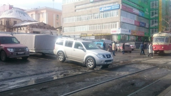 На ВИЗ-бульваре. Днем 10 марта 2017 года пассажиры екатеринбургских трамваев вынуждены были продолжить свой путь пешком. На ВИЗ-бульваре внедорожник с прицепом перегородил проезд электротранспорту. Фото автомобиля появилось в соцсетях, передает "Уралинформбюро". Все фото: Антонина Колесникова, "ВКонтакте" За считанные минуты на путях скопились как минимум шесть составов. Пользователи соцсетей сошлись во мнении, что всему виной гололед на парковке возле мебельного торгового центра и неподтянутый ручник. Машина просто скатилась под уклон под собственной тяжестью. Скорее всего, теперь незадачливому водителю придется возместить ЕТТУ ущерб за простой электротранспорта, считают интернет-жители.