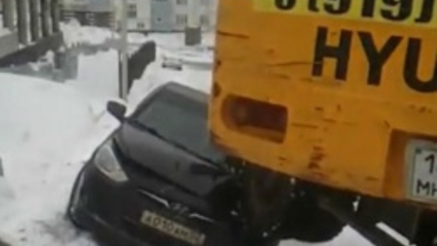 В Уфе эвакуатор наехал на машину, которая была припаркована во дворе. ДТП произошло на улице Габдуллы Амантая. О происшествии сообщил один из подписчиков группы «БашДТП». Как видно на кадрах, которые опубликованы в социальной сети, автомобиль Hyundai получил серьёзные повреждения бампера. Также спецмашина разбила лобовое стекло "легковушки". Обстоятельства произошедшего пока не известны. Очевидцы предположили, что экскаватор занесло из-за погодных условий.