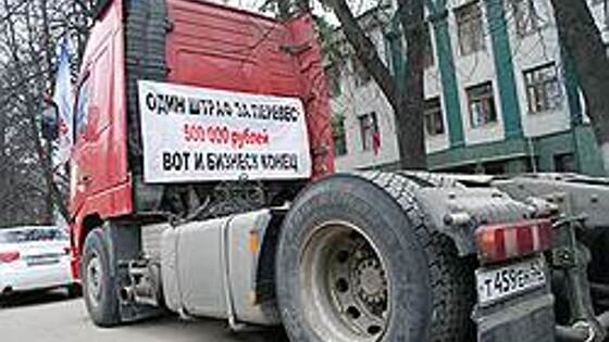 Фотофакт Вчера утром у здания министерства транспорта и автомобильных дорог Нижегородской области появилась фура без прицепа, на которой были размещены два плаката «За такие дороги — шиш, а не налоги» и «Один штраф за перевес 500 000 рублей — вот и бизнесу конец». Организатором такого одиночного пикета стало региональное отделение «Объединения перевозчиков России» (ОПР). Как рассказал „Ъ“ координатор нижегородского отделения ОПР Алексей Лазарев, таким образом перевозчики пытаются привлечь внимание чиновников к своим проблемам: «Они нас не видят и не слышат. Сегодня к нам даже не вышел никто. Министерство вызвало ГИБДД, сотрудники которой приехали, проверили у водителя документы и уехали. Мы хотим показать, что мы есть, и что в следующий раз будем стучать в дверь». Алексей Лазарев говорит, что пикет проходит в рамках бессрочной всероссийской акции перевозчиков, которые не довольны работой системы «Платон», уровнем налогов и качеством дорог, и что сейчас обсуждается возможность провести повторный пикет у министерства. Он также добавил, что два бессрочных одиночных пикета — фуры с плакатами — продолжают стоять на трассе М7 на повороте на Дзержинск и около торгового центра «Открытый материк» на улице Ларина. Александра Викулова