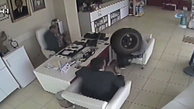 Видео: В Турции влетевшее в аптеку колесо травмировало посетителей