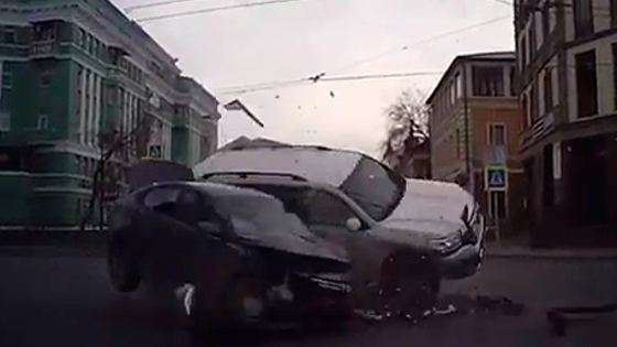 Камера видеорегистратора запечатлела страшное ДТП, произошедшее в центре Казани. На кадрах видеоролика показано, как на перекрестке, на зеленый разрешающий сигнал светофора было организовано движение. После того, как автомобили, стоящие в левой полосе начали движение случилась авария. Во внедорожник, следующий по правилам, на полной скорости влетела легковая машина. Удар был такой силы, что джип перевернулся, и обе машины отлетели в сторону.