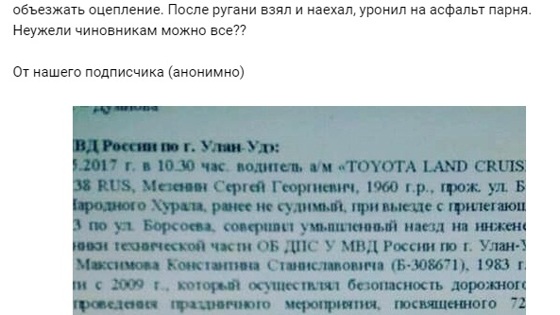 В Улан-Удэ депутат Народного Хурала Бурятии Сергей Мезенин, пытаясь проехать сквозь оцепление 9 мая, совершил наезд на сотрудника ДПС. Об этом сообщают местные СМИ. Сообщение о ДТП с участием появилось в соцсетях, после чего на него обратили внимание журналисты. Анонимный пользователь сообщил, что нетрезвый депутат 9 мая в 10.30 совершил наезд на полицейского, не желая объезжать выставленное оцепление. После словесной перепалки Мезенин, как утверждает автор сообщения, наехал на полицейского, уронив того на асфальт. В подтверждение своих слов автор сообщения привел фотографию внутренней сводки МВД, которая подтверждает его слова. Согласно документу, на водителя составили административный протокол за езду в пьяном виде. В МВД Бурятии "Газете.Ru" также подтвердили факт инцидента с участием Мезенина, а также составление на него административного протокола.
