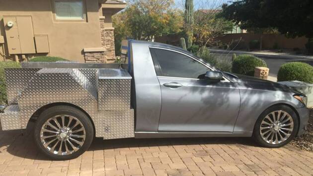 На портале Craigslist появилось объявление о продаже необычного автомобиля — это пикап на базе седана Hyundai Genesis 2015 модельного года. Пробег машины с пятилитровым V8 составляет 1400 миль (около 2250 километров). Продавец хочет за нее 16 500 долларов. Согласно объявлению, владелец автомобиля решил переделать его в пикап после серьезной аварии, в которой пострадали передняя и задняя части. Восстановив «нос», он решил реализовать давнюю идею по трансформации седана в пикап. В сообщении сказано также, что продавцу всегда нравились Hyundai Genesis с восьмицилиндровым мотором — с 2009 года он приобрел пять таких четырехдверок (последним стал седан G80, вышедший под маркой Genesis — преемник «Дженезиса», продавашегося как Hyundai). Для трансформации машины владелец использовал алюминиевые листы. Грузовая платформа у пикапа полностью открытая и не имеет задней крышки. По словам хозяина, более легкий кузов сделал автомобиль с 420-сильным мотором и 8-ступенчатым «автоматом» заметно быстрее. Продать автомобиль он решил после недавнего инцидента — некто поцарапал пикап ключом и разбил заднее стекло. В причинах продавец указал также, что ему 77 лет и он устал. В комплекте с машиной владелец отдаст некоторые оригинальные части седана — это задний диван и элементы кузова наряду с колесами, которые он заменил на хромированные диски Kia с низкопрофильными покрышками Continental. Однако трансформированный автомобиль не поставлен на учет.