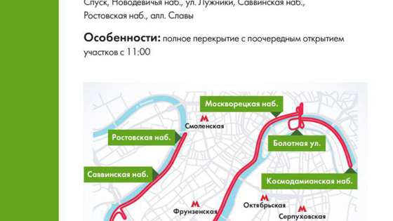 Московских водителей предупреждают об ограничениях движения на дорогах в ближайшие дни и просят заранее планировать маршруты. В пятницу, 19 мая, в связи с проведением религиозных мероприятий с 10:00 до 14:00 для проезда будет закрыта Большая Татарская улица. Поменять планы автомобилистов может и традиционный легкоатлетический кросс «Печатниковское кольцо», который пройдет в субботу, 20 мая. Проезд закроют на участке улицы Гурьянова от улицы Кухмистерова до дома 61 с 11:45 до 13:15. А в воскресенье, 21 мая, центральные улицы столицы отдадут любителям бега: по набережным побегут участники Московского полумарафона. Из-за этого для проезда с 08:00 до 13:40 закроют Лужнецкую, Фрунзенскую, Пречистенскую, Кремлевскую набережные, Москворецкую улицу, Большой Москворецкий мост, улицу Балчуг, Раушскую, Космодамианскую, Шлюзовую, Софийскую набережные, Фалеевский переулок, Болотную улицу, площадь Васильевский Спуск, Новодевичью набережную, улицу Лужники, Саввинскую и Ростовскую набережные.