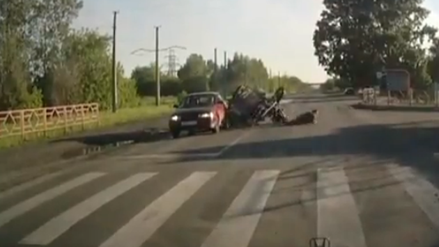 Видео: vk/ru_chp Очевидцы сообщили об аварии в Новокузнецке. Там мотоцикл, на котором ехали молодые люди, влетел в стоящий перед пешеходным переходом автомобиль, после чего перевернулся. Пассажиры выпали из него на асфальт. "Слава богу все живы, но двух девочек я завез в травму", - написал очевидец под опубликованном в соцсети видео.