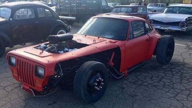 Сумасшедший Rat Rod вышел из Porsche 911 и Jeep Wrangler - две разноплановые машины специально соединили вместе. Неизвестно то, является ли этот проект результатом работы какой-то тюнинговой компания, либо же перед нами творение умельца-одиночки, пожелавшего остаться без упоминания. Впрочем, проект в любом случае вышел, по меньшей мере, удивительным! Переднюю часть явно «пересадили» от Jeep Wrangler. Такой вывод мы делаем, глядя на решетку радиатора и фары а прямо позади - отличный двигатель, неизбежно. А вот кабина, кажется, взята от 911-го «Порше» 1990 года. Невероятно странный симбиоз! Относительно мотора известно, что здесь стоит могучий V8 от Chevrolet. Больше никаких подробностей, касающихся механики, нет.