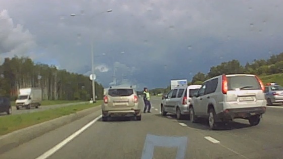 Перебегавший дорогу автоинспектор едва не угодил под колеса легковушки и стал причиной столкновения двух машин в Казани. Телеканал «360» публикует запись с камеры регистратора. ДТП произошло днем 20 июня на Мамадышском тракте, близ трассы М-7. На кадрах видно, как Renault Duster останавливается перед ступившим на проезжую часть полицейским, направлявшимся в сторону стоящей на обочине патрульной машины. Водитель двигавшейся в соседнем ряду Lada Largus с опозданием заметил пешехода в форме, но успел затормозить, а вот владелец следовавшего за ним на высокой скорости Nissan остановиться не успел и врезался в универсал. Последний отбросило вперед, так что автомобиль едва не сбил виновника ДТП. Инспектор, впрочем, отпрыгнул в сторону, после чего направился к водителю кроссовера, которые, по его мнению, не соблюдал безопасную дистанцию.