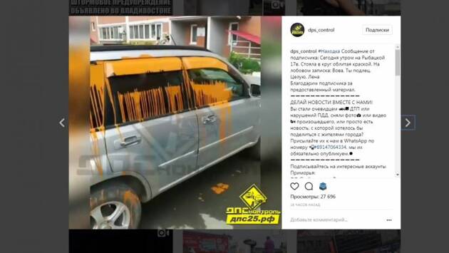 Накануне в Находке произошло необычное происшествие на парковке возле одного из домов на улице Рыбацкой, сообщает PRIMPRESS. На парковке стоял серый внедорожник, облитый оранжевой краской. На лобовом стекле была записка: «Вова, ты подлец. Целую, Лена». Никаких подробностей истории неизвестно, поэтому пользователи соцсетей стали придумывать свои версии. Кто-то предположил, что Лену подставили: другая женщина или даже мужчина. Другие писали, что Лена перепутала машины. Третья версия: Лена уехала в другой город и сменила имя, чтобы Вова ее не убил. Кто-то предположил, что это шутка: краска смывается, а под запиской лежит 300 рублей на мойку.