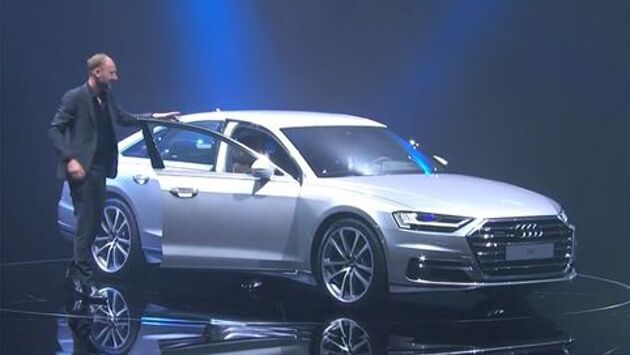Компания Audi представила флагманский седан A8 нового поколения. Модель получила систему автопилотирования в пробках, необычную подвеску, способную приподнимать кузов перед ДТП и колеса перед кочками, автопарковщик, которому не требуется присутствие водителя в салоне, функцию массажа ступней пассажиров второго ряда и дизайн интерьера, непохожий ни один другой в семействе марки. Габаритная длина новинки составляет 5172 миллиметра (5302 миллиметра в случае удлиненной версии с индексом L), ширина – 1945 миллиметров, высота – 1473 миллиметра, а размер колесной базы равен 2998 миллиметрам (3128 миллиметров у модификации L). Таким образом, седан получился на 37 миллиметров длиннее предшественника, на четыре миллиметра уже и на 13 миллиметров выше. Расстояние между осями возросло на шесть миллиметров. Внешность A8 выполнена в новой стилистике Audi. Модель использует матричные лазерные фары и фонари на органических светодиодах, а в салоне – новую центральную консоль с двумя дисплеями и минимум физических кнопок. Верхний сенсорный дисплей с диагональю 10,1 дюйма, а со второго, 8,6-дюймового, дисплея осуществляется управление климат-контролем, ввод текстовой информации, например, для навигации. Все сенсорные кнопки при нажатии имеют тактильный отклик. Чтобы попасть в автомобиль, вместо ключа можно использовать смартфон с модулем беспроводной связи NFC, который нужно будет поднести к дверной ручке, чтобы открыть замки. Помимо обычных для этого класса задних кресел с массажем и вентиляцией, появился опциональный массаж ступней пассажира. Специальный блок, встроенный в спинку переднего сиденья, имеет подогрев, три настройки интенсивности и два вида массажа. Также есть (как спереди, так и сзади) подогрев дверных и центральных подклокотников. Управление мультимедийным комплексом и настройками кресел осуществляется с помощью специального съемного пульта. Он имеет алюминиевый корпус и 5,7-дюймовый экран на органических светодиодах с разрешением FullHD. Кроме того, на подголовниках передних сидений крепятся 10,1-дюймовые планшеты на Android, которые подключены к MMI и имеют доступ в интернет по Wi-Fi. Их можно снять и использовать вне машины. Также в заднюю полку встроен специальный датчик света, который в случае, если солнце светит сзади, дает команду изменить настройки климат-контроля, ионизатор. Седан имеет систему ароматизации воздуха (два варианта запаха), аудиокомплекс Bang & Olufsen с 23 динамиками, проекционный дисплей, самообучаемую навигацию, беспроводные зарядки для смартфонов (спереди и сзади), круговой видеообзор, адаптивный круиз и пробочный автопилот. Автопилот работает на скорости до 60 километров в час, заведуя рулевым управлением, газом и тормозом, а также может своевременно среагировать, если кто-то подрежет и резко вклинится перед машиной. В Audi утверждают, что водителю даже не нужно держать руки на руле. Специальная камера в салоне будет следить за состоянием водителя: если он заснет, то электроника разбудить его сигналом, но если реакции не последует, то машина плавно затормозит до полной остановки. В связи с необходимым изменением законодательства такую систему начнут устанавливать на Audi в Германии только с 2019 года. Автопарковщик может без участия водителя и необходимости его нахождения в салоне припарковать машину как параллельно, так и в гараж. Работ
