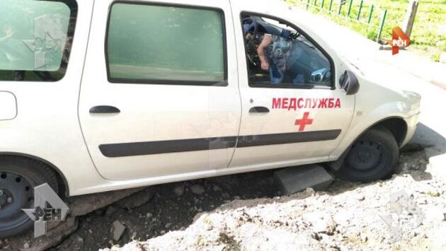 Фото: автомобиль медслужбы, перевозивший кровь в роддом, провалился в яму на дороге в Москве