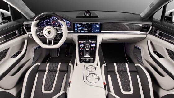 Российское ателье TopCar . На этот раз владельцам предлагается персонализировать интерьер немецкого хэтчбека двухцветной тонкой кожей с вставками из кожи крокодила, а также декоративными панелями из карбона и ценных пород дерева. В какую сумму обойдутся доработки, пока не сообщается. Но, судя по вышедшему ранее пакету для экстерьера, стоить такой салон недешево. Напомним, стилизация внешнего вида Panamera была оценена почти в полтора миллиона рублей. Проект под названием Stingray GTR Edition включил в себя набор карбоновых элементов, из которого выполнены бамперы, передние и задние крылья, капот, боковые пороги, массивные накладки на передние и задние двери, а также аэродинамический спойлер. Финальным штрихом к агрессивному образу Panamera стали новые колёсные диски от HRE, ADV.1, 1221.