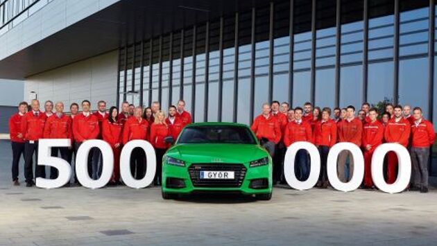 С конвейера завода Audi в Дьере (Венгрия) сошёл 500 000-й автомобиль. Им оказался Audi TTS в зелёном цвете. Столь почётная честь стать юбилейным автомобилем выпала купе TTS от «Ауди» в краске Viper Green. Завод был открыт в 1998 году и сегодня его сотрудники занимаются тем, что производят TT в версиях купе и родстер, а также осуществляют сборку седана и кабриолета A3. Вскоре к ним добавится ещё и парочка новых моделей - кроссоверы Q3 и Q4. Именно потому многие уже даже не сомневаются, что пройдёт всего с десяток лет, и нужно будет праздновать выпуск миллионного экземпляра. Около 4000 человек отвечают за изготовление TT на венгерском заводе. Кстати, о производстве Q3 в Венгрии: его сюда перенесут с нынешней сборочной площадки в Испании. Вероятно, что это случится после того, как дебютирует новая генерация компактного «паркетника». В 2016 году на заводе в городе Дьер ведут сборку не только машин, но и двигателей. В прошлом году Audi Hungaria выпускала шесть различных типов бензиновых двигателей и пять типов дизельных силовых установок.