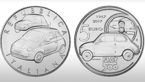 На аверсе монеты изображен оригинальный Fiat 500 1957 года и современная версия модели. На реверсе — классическая машина и даты 1957-2017, соответствующие началу производства модели и году выпуска памятной монеты.