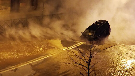 В Петербурге после прорыва труб машина провалилась в яму