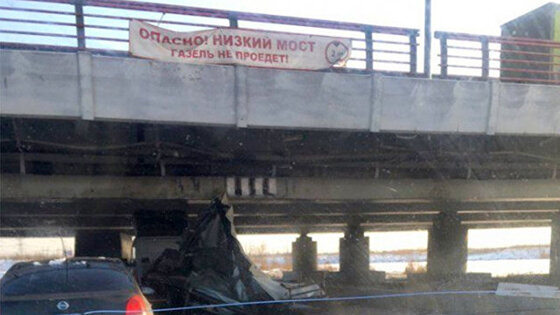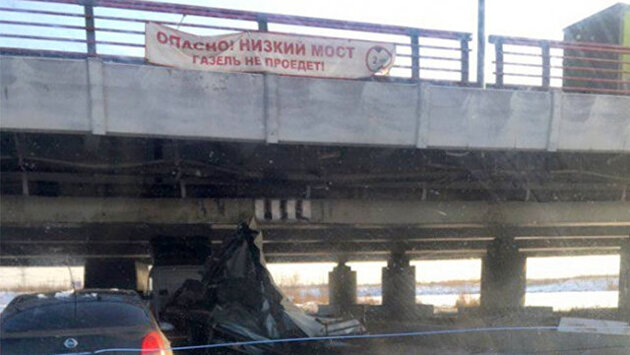 На мосту висит большой плакат «Опасно! Низкий мост! Газель не проедет!», но «Газели» снова и снова пытаются прорваться вперед и застревают.