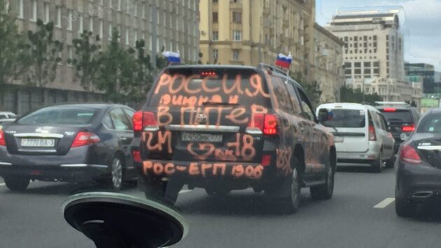 На московских улицах заметили внедорожник Toyota Land Cruiser, весь расписанный патриотическими и футбольными надписями из баллончика с краской. Так столичный футбольный болельщик выразил свою радость по поводу выхода сборной России в плей‐офф. На кузове автомобиля ценой в несколько миллионов рублей буквально не осталось места, свободного от надписей. Похоже, что фанат настолько проникся победой сборной России, что нанес на автомобиль надписи — щедро и размашисто, да так, что попало даже на стекла. Источник фото: телеканал «360» «Ура!», «Россия, вперед!», Russia 2018», «Россия 19 июня в Питере», «Рос-Егп 19.06», «ЧМ♥18» и даже «USSR» — радостно выводил хозяин внедорожника после удачного выступления отечественной сборной на чемпионате мира. Теперь раскрашенная машина с московскими номерами рассекает по улицам столицы, радуя москвичей и гостей города. На официальном сайте производителя цена такого нового автомобиля начинается от 3,7 миллиона рублей. В период проведения чемпионата мира по футболу во множестве заведений Подмосковья действуют футбольные акции, в закусочных и магазинах обновлен ассортимент товаров, а в салонах красоты популярными стали маникюр и макияж на футбольную тематику. Макияж болельщицы в одном из салонов красоты Химок — услуга новая, но быстро набирающая популярность, причем даже у сильного пола.