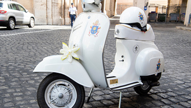 Папа Римский Франциск получил в подарок мотороллер итальянской марки Vespa. Как сообщает в воскресенье служба печати Святого Престола, транспортное средство понтифику передали в ходе встречи с ним участники Второго международного съезда владельцев этих мотороллеров.