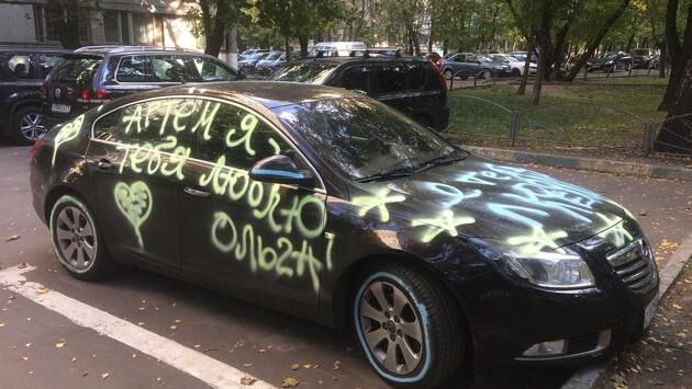 На фото видно, что на правой стороне автомобиля марки Opel написано «Артем, я люблю тебя. Ольга», а на капоте — «Я люблю тебя. Лелик». Также на левой стороне машины есть надпись «22.09.2018, ура!», возможно, отсылающая к какому-то событию. Мотивы разукрасившей машину женщины неизвестны.