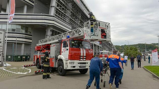 По сценарию учений, пожар произошел в рабочем помещении на Главной трибуне. Огонь распространился, произошло задымление лестничной клетки, создалась угроза тем, кто был на расположенных выше этажах. Но сотрудники МЧС оперативно ликвидировали возгорание и провели эвакуацию людей.