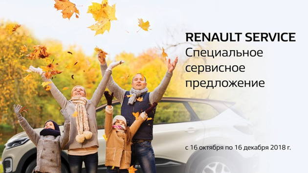 Renault Россия объявляет о запуске сезонной сервисной кампании для всех владельцев автомобилей Renault, которая пройдет с 16 октября по 16 декабря 2018 года в официальных дилерских центрах. В рамках кампании владельцев автомобилей Renault ждут особые условия на приобретение таких продуктов и услуг, как: Запчасти (подвеска, рулевая тяга и др.) с выгодой до 15%; Аккумуляторы с выгодой до 10%; Комплекты зимних колес в сборе с выгодой до 15%; Щетки стеклоочистителя с выгодой до 20%; Средство для обработки лобового стекла – антидождь Renault Rain Protect всего за 699 руб. Более подробная информация о сезонной сервисной кампании Renault доступна на сайте renault.ru/services/offers. Владельцы автомобилей Renault любого возраста могут подобрать программу «Комплекс-Сервис» для своего автомобиля на сайте: renault.ru/services/maintenance. Еще больше предложений доступно для пользователей MY RENAULT. Сервис MY RENAULT – это полезный инструмент для владельцев автомобилей Renault, который напоминает о предстоящих сервисных операциях и отслеживает специальные предложения Renault Service для конкретного автомобиля. Сервис доступен к использованию как на сайте renault.ru, так и в мобильных приложениях на платформах Android и iOS. Данная программа была запущена в России в декабре 2011 года и насчитывает уже более 620 000 зарегистрированных клиентов. Получить более подробную информацию обо всех предложениях Renault Service, а также уточнить условия участия конкретного дилера в акции можно на сайте Renault c 16 октября 2018 года. Вам также будет интересно узнать: Renault россия запускает сезонную сервисную кампанию Филипп тьер назначен на должность коммерческого директора renault россия Руководители renault россия стали лауреатами престижного рейтинга «топ-1000 российских менеджеров»