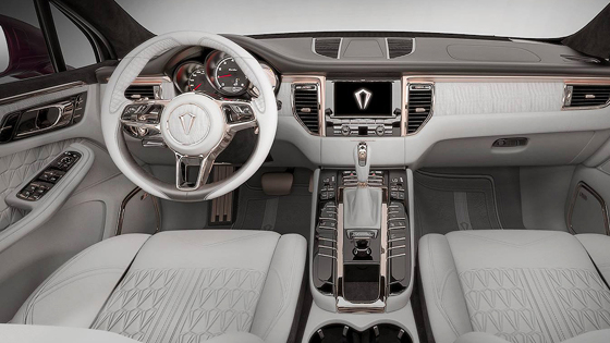 Большая часть интерьера «Макана» обшита светло-кремовой кожей. Черной алькантарой отделаны стойки, верхние части дверей и потолок, а из розового золота выполнены элементы на руле, передней панели и центральной консоли, на дверях, рычаге коробки передач и даже площадке для отдыха левой ноги.