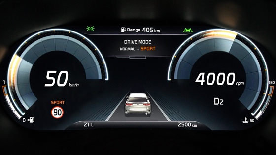 Для каждого из четырех ездовых режимов предусмотрено свое графическое оформление. Например, в Sport акцент делается на данные о скорости и оборотах двигателя, а в Normal — на экономичности поездки и расстоянии. В будущем, утверждают в Kia, цифровая приборная панель будет адаптирована для всего модельно ряда, в том числе гибридов и электрокаров. В последнем случае водитель сможет получать информацию о взаимодействии различных компонентов силовой установки и движении электроэнергии.