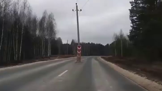 На кадрах видно, как посреди недавно отремонтированной проезжей части стоит столб. Отмечается, что вдоль дороги не установлено знаков, предупреждающих водителей о предстоящем препятствии.
