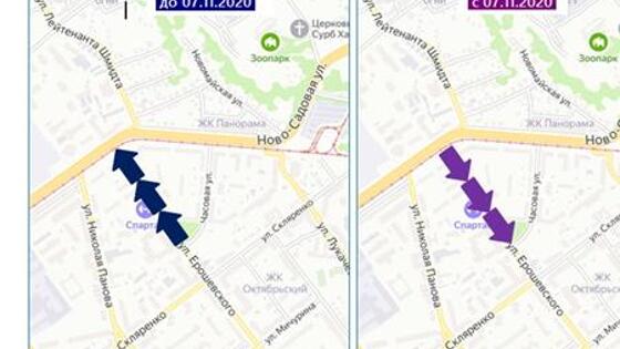Движение транспорта будет организовано в противоположном направлении в одностороннем режиме, от ул. Ново-Садовой по ул. Ерошевского.