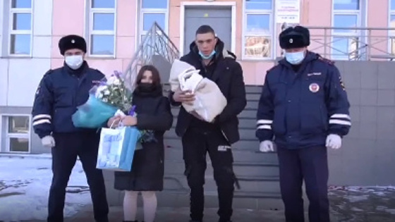 В Благовещенске ранним утром к автоинспекторам на посту ДПС ГИБДД обратился водитель с просьбой оказать помощь в транспортировке в перинатальный центр женщины, у которой в машине начались роды. В связи с тем, что на проезжей части была гололедица, автомобили двигались в плотном потоке с низкой скоростью, сотрудниками полиции было принято решение сопроводить данную машину до медучреждения. Два экипажа ОБ ДПС ГИБДД МО МВД России «Благовещенский» в составе заместителя командира взвода ДПС ГИБДД старшего лейтенанта полиции Краснощёкова Василия, старшего инспектора ДПС ГИБДД лейтенанта полиции Маковчика Александра и инспектора ДПС ГИБДД старшего лейтенанта полиции Бурчика Андрея обеспечили беспрепятственный проезд транспортного средства с роженицей в перинатальный центр. Уже через несколько минут с момента прибытия в больницу женщина под присмотром врачей родила здорового малыша весом 3 килограмма 200 граммов, которого назвали Кириллом. Сотрудники Госавтоинспекции сделали молодой семье сюрприз, приехав на выписку матери и новорождённого. Они от всей души поздравили женщину и её супруга с рождением сына, вручили цветы и подарок. Молодые родители поблагодарили сотрудников полиции за помощь в экстренной ситуации.